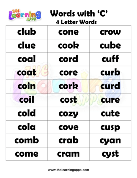 Download free printable 4 Letter words that start with C. Introduce kids to these Alphabet worksheets before starting their education. Try Now It’s free!