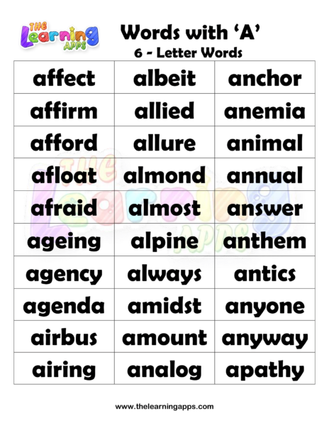Download free printable 6 Letter words that start with A. Introduce kids to these Alphabet worksheets before starting their education. Try Now It’s free!