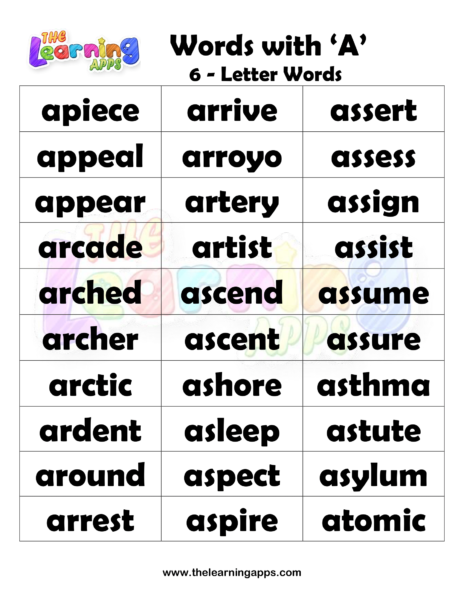 Download free printable 6 Letter words that start with A. Introduce kids to these Alphabet worksheets before starting their education. Try Now It’s free!