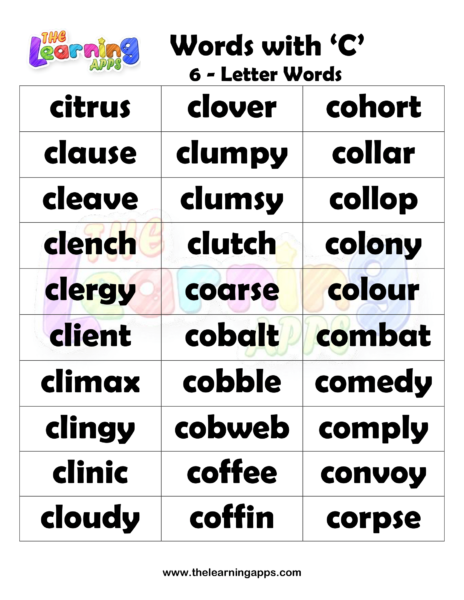 Download free printable 6 Letter words that start with C. Introduce kids to these Alphabet worksheets before starting their education. Try Now It’s free!