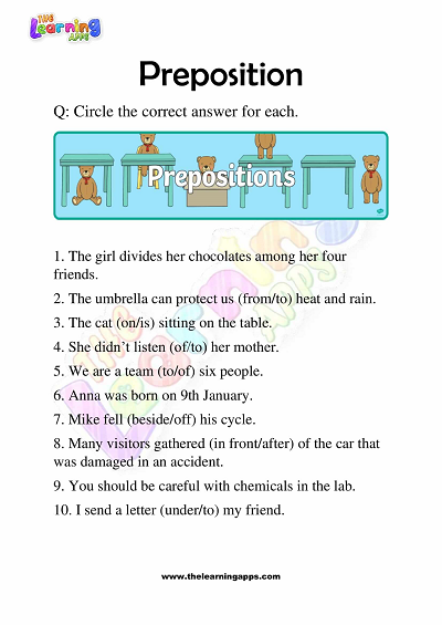 Prepositions for grade 3 worksheets can be tricky grammar for 3rd graders if not practiced and learned correctly. Therefore, we at the learning apps bring you worksheets of Prepositions for grade 3 to help them conquer the skill and method for performing Prepositions for grade 3 worksheet questions.