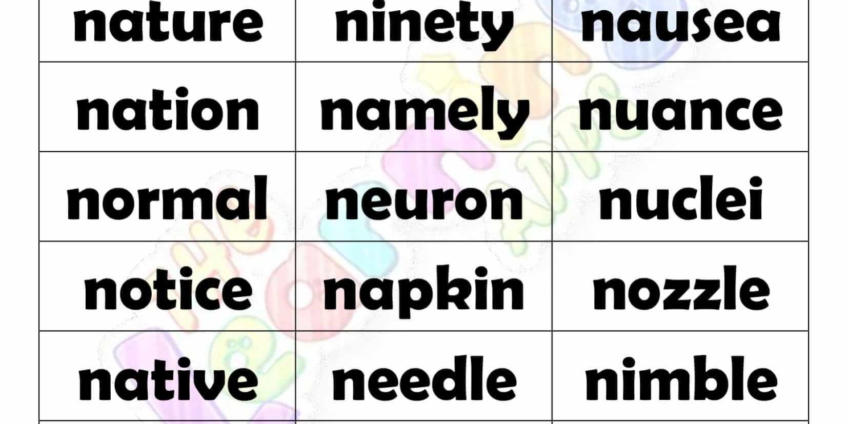 Download free printable 5 Letter words that start with N. Introduce kids to these Alphabet worksheets before starting their education. Try Now It’s free!