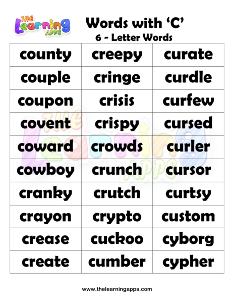Download free printable 6 Letter words that start with C. Introduce kids to these Alphabet worksheets before starting their education. Try Now It’s free!