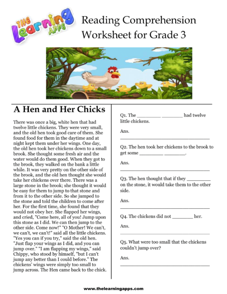 Download our free printable comprehension worksheets for grade 3.A Hen and Her Chicks Comprehension Worksheet is one of the best worksheet to engage your third grade child in reading and learning.