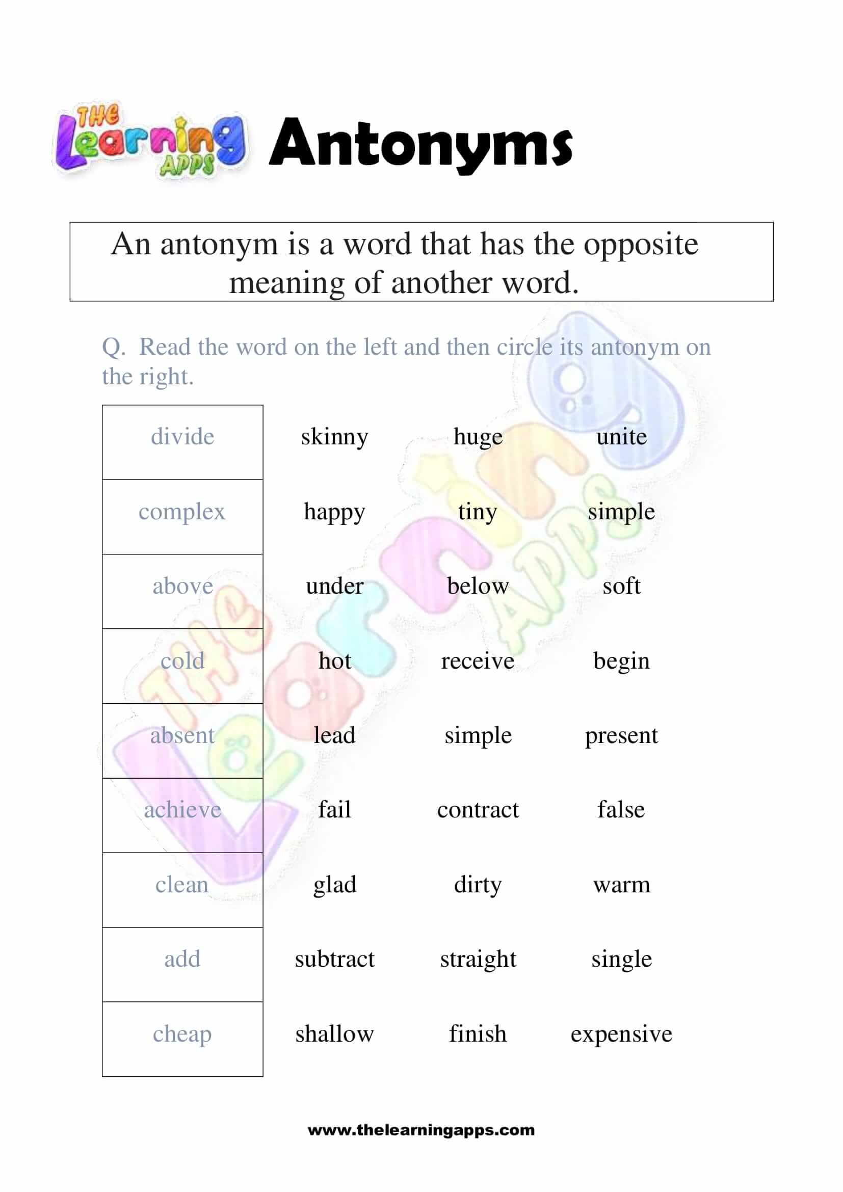 Views: 1,959 Coming soon.. Antonyms Grade 1 Worksheet 02 View All Activities Here you will have an educational and free printable Antonyms Grade 1 Worksheet for kids. By doing these worksheets, kids will learn about Antonyms in a fun and interactive way. Hit the download button and let the learning begin! Download View Category Antonyms Subject English Share This Related PostsAntonyms Grade 1 Worksheet 10August 16, 2022Antonyms Grade 1 Worksheet 09August 16, 2022Antonyms Grade 1 Worksheet 08August 16, 2022Antonyms Grade 1 Worksheet 07August 16, 2022Antonyms Grade 1 Worksheet 06August 16, 2022Antonyms Grade 1 Worksheet 05August 16, 2022