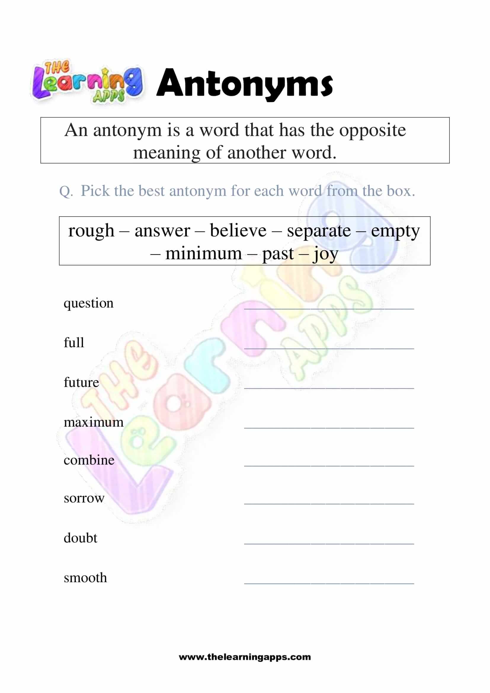 Views: 2,047 Coming soon.. Antonyms Grade 1 Worksheet 04 View All Activities Here you will have an educational and free printable Antonyms Grade 1 Worksheet for kids. By doing these worksheets, kids will learn about Antonyms in a fun and interactive way. Hit the download button and let the learning begin! Download View Category Antonyms Subject English Share This Related PostsAntonyms Grade 1 Worksheet 10August 16, 2022Antonyms Grade 1 Worksheet 09August 16, 2022Antonyms Grade 1 Worksheet 08August 16, 2022Antonyms Grade 1 Worksheet 07August 16, 2022Antonyms Grade 1 Worksheet 06August 16, 2022Antonyms Grade 1 Worksheet 05August 16, 2022