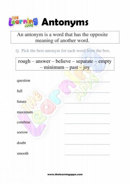 Views: 2,013 Coming soon.. Antonyms Grade 1 Worksheet 04 View All Activities Here you will have an educational and free printable Antonyms Grade 1 Worksheet for kids. By doing these worksheets, kids will learn about Antonyms in a fun and interactive way. Hit the download button and let the learning begin! Download View Category Antonyms Subject English Share This Related PostsAntonyms Grade 1 Worksheet 10August 16, 2022Antonyms Grade 1 Worksheet 09August 16, 2022Antonyms Grade 1 Worksheet 08August 16, 2022Antonyms Grade 1 Worksheet 07August 16, 2022Antonyms Grade 1 Worksheet 06August 16, 2022Antonyms Grade 1 Worksheet 05August 16, 2022