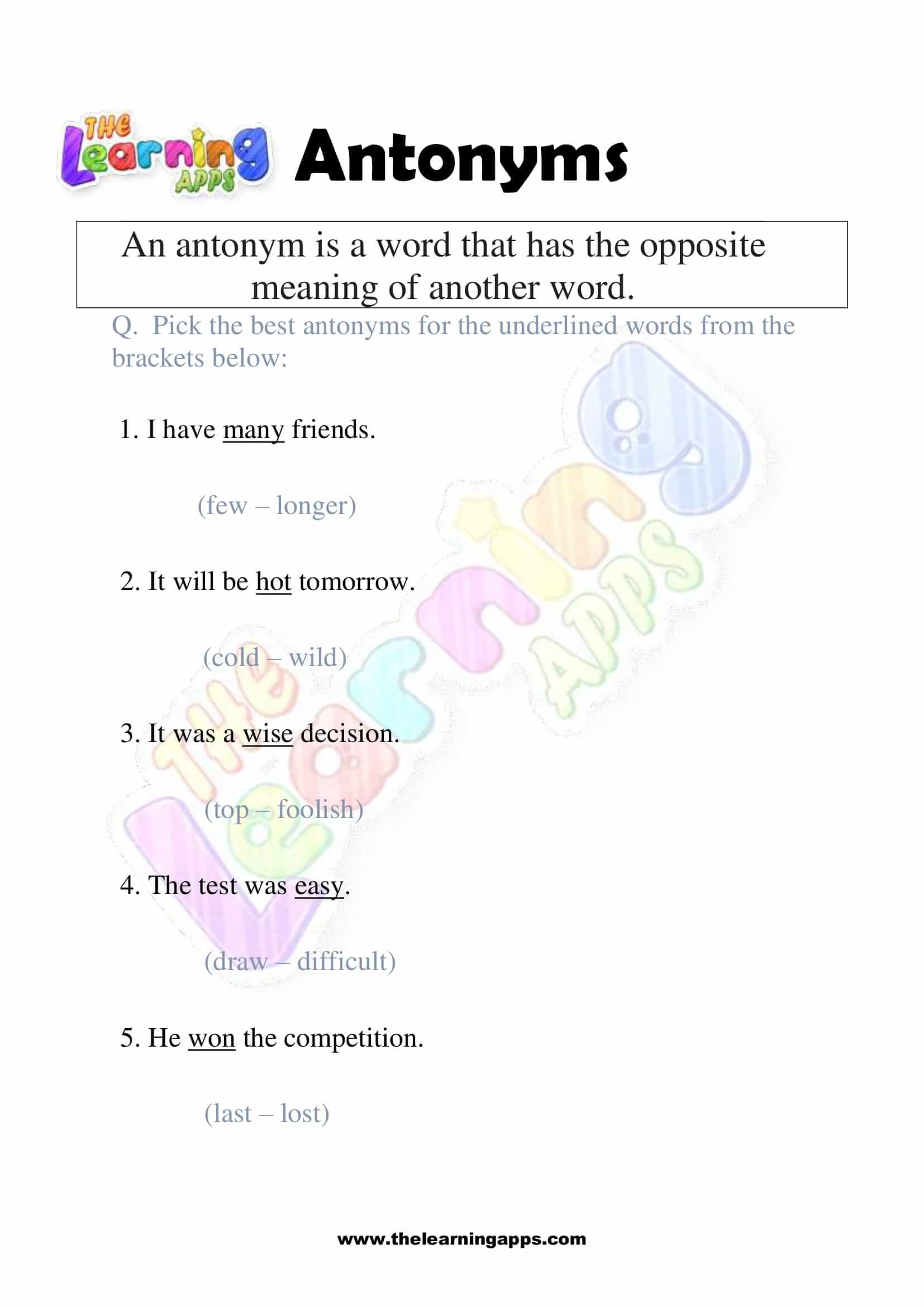 Views: 2,442 Coming soon.. Antonyms Grade 1 Worksheet 06 View All Activities Here you will have an educational and free printable Antonyms Grade 1 Worksheet for kids. By doing these worksheets, kids will learn about Antonyms in a fun and interactive way. Hit the download button and let the learning begin! Download View Category Antonyms Subject English Share This Related PostsAntonyms Grade 1 Worksheet 10August 16, 2022Antonyms Grade 1 Worksheet 09August 16, 2022Antonyms Grade 1 Worksheet 08August 16, 2022Antonyms Grade 1 Worksheet 07August 16, 2022Antonyms Grade 1 Worksheet 05August 16, 2022Antonyms Grade 1 Worksheet 04August 16, 2022