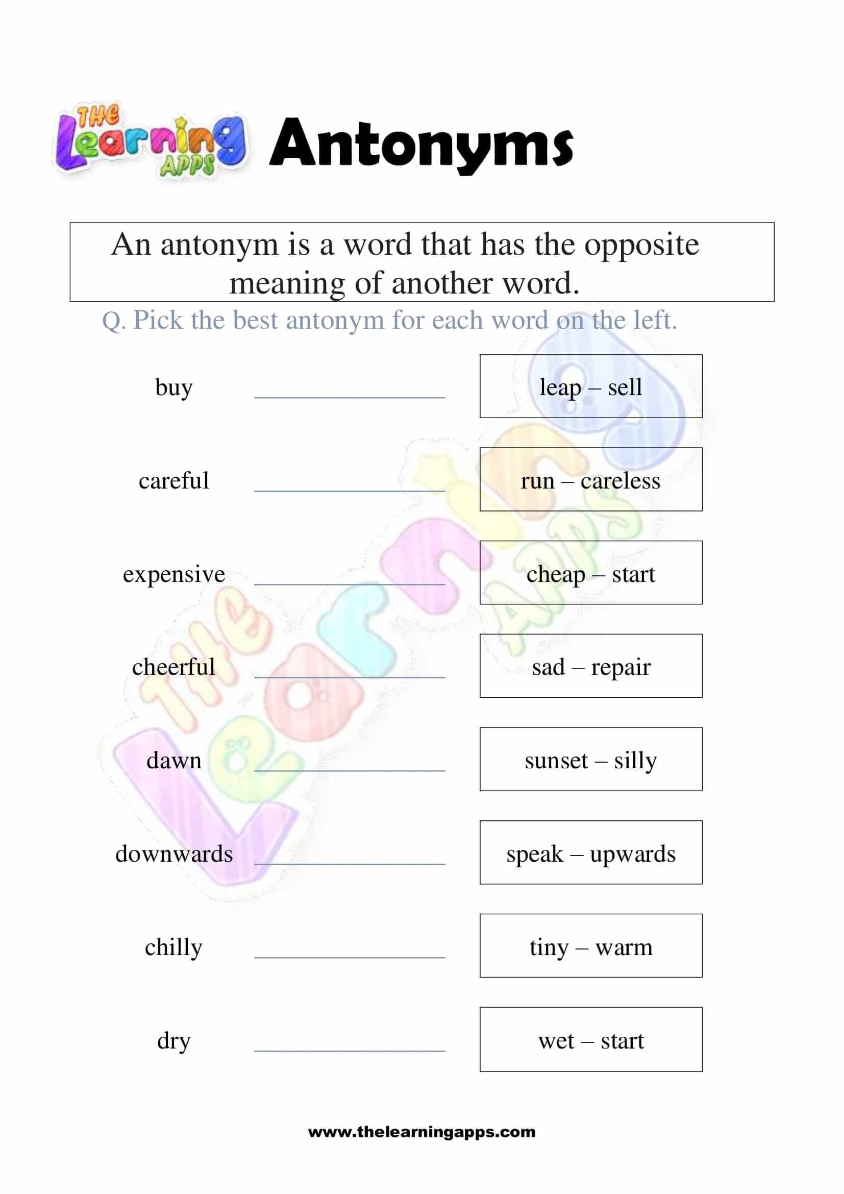 Views: 2,293 Coming soon.. Antonyms Grade 1 Worksheet 07 View All Activities Here you will have an educational and free printable Antonyms Grade 1 Worksheet for kids. By doing these worksheets, kids will learn about Antonyms in a fun and interactive way. Hit the download button and let the learning begin! Download View Category Antonyms Subject English Share This Related PostsAntonyms Grade 1 Worksheet 10August 16, 2022Antonyms Grade 1 Worksheet 09August 16, 2022Antonyms Grade 1 Worksheet 08August 16, 2022Antonyms Grade 1 Worksheet 06August 16, 2022Antonyms Grade 1 Worksheet 05August 16, 2022Antonyms Grade 1 Worksheet 04August 16, 2022