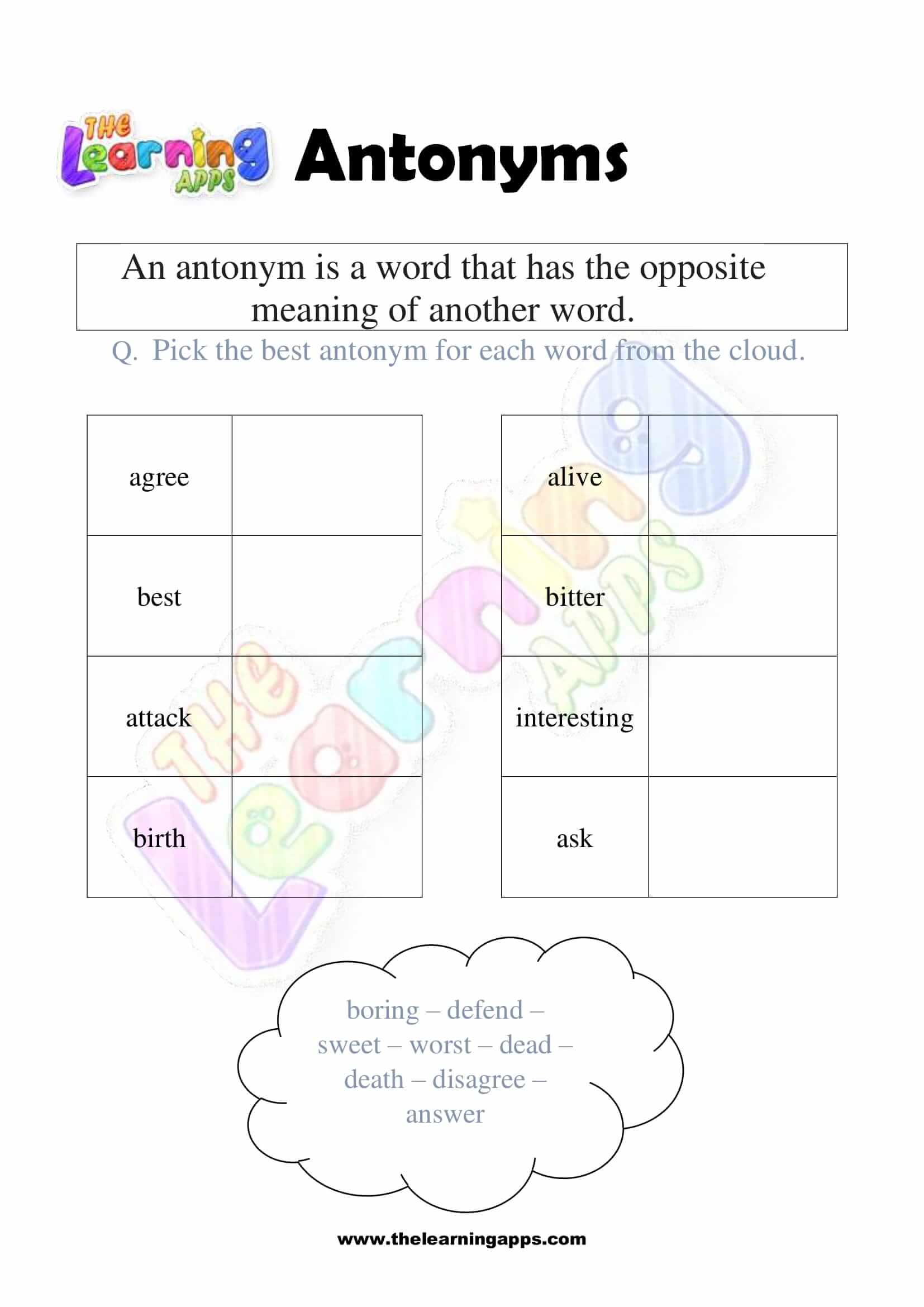 Views: 1,978 Coming soon.. Antonyms Grade 1 Worksheet 10 View All Activities Here you will have an educational and free printable Antonyms Grade 1 Worksheet for kids. By doing these worksheets, kids will learn about Antonyms in a fun and interactive way. Hit the download button and let the learning begin! Download View Category Antonyms Subject English Share This Related PostsAntonyms Grade 1 Worksheet 09August 16, 2022Antonyms Grade 1 Worksheet 08August 16, 2022Antonyms Grade 1 Worksheet 07August 16, 2022Antonyms Grade 1 Worksheet 06August 16, 2022Antonyms Grade 1 Worksheet 05August 16, 2022Antonyms Grade 1 Worksheet 04August 16, 2022