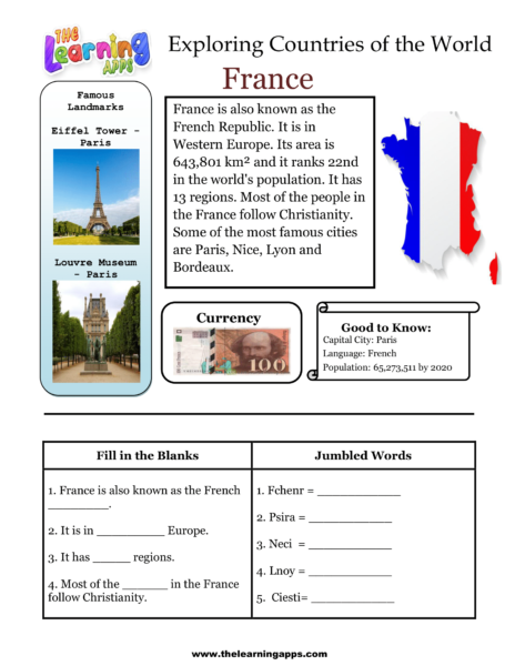 Bonjour! Explore the captivating country of France with our France worksheet free for kids. France is celebrated for its iconic landmarks like the Eiffel Tower, delectable cuisine, and rich artistic heritage.