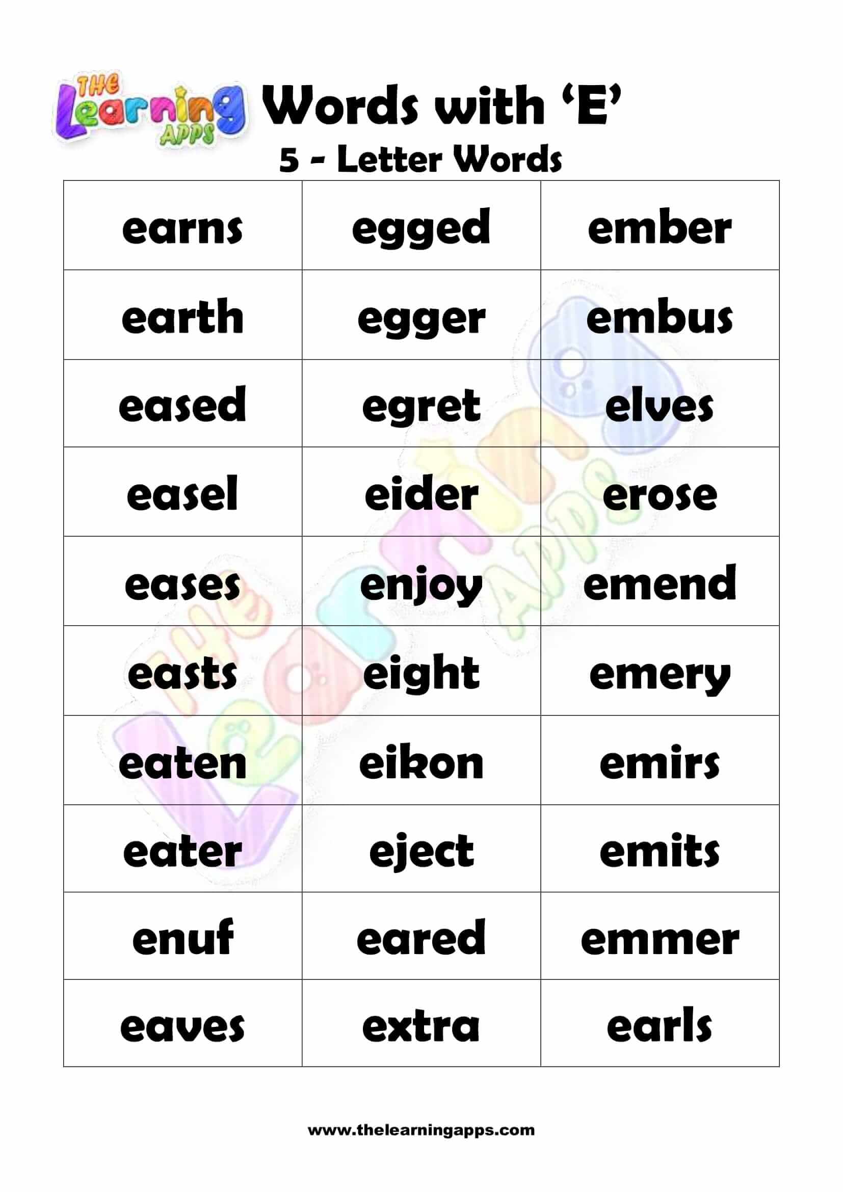 Scarica gratuitamente le parole di 5 lettere stampabili che iniziano con E. Presenta ai bambini questi fogli di lavoro dell'alfabeto prima di iniziare la loro istruzione. Prova ora È gratis!