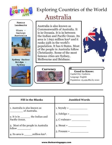 ດາວໂຫລດແຜ່ນວຽກນີ້ສໍາລັບລູກຫຼືນັກຮຽນຂອງທ່ານໂດຍບໍ່ເສຍຄ່າແລະໃຫ້ພວກເຂົາຮຽນຮູ້ຂໍ້ເທັດຈິງແລະລາຍລະອຽດກ່ຽວກັບອົດສະຕາລີ. ແຜ່ນວຽກທີ່ຫນ້າອັດສະຈັນນີ້ບໍ່ພຽງແຕ່ມ່ວນ, ແຕ່ມັນຍັງຕື່ນເຕັ້ນຫຼາຍເພາະວ່າມັນຊ່ວຍໃຫ້ເດັກນ້ອຍໄດ້ຮຽນຮູ້ແລະຄົ້ນຫາເພີ່ມເຕີມກ່ຽວກັບປະເທດທີ່ເຂົາເຈົ້າມັກໃນແບບທີ່ມ່ວນທີ່ສຸດ. ກົດປຸ່ມດາວໂຫຼດແລະໄດ້ຮັບໃບເຮັດວຽກທີ່ພິມໄດ້ຟຣີໃນມື້ນີ້.