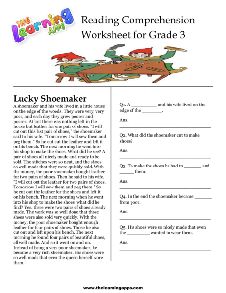 Download our free printable comprehension worksheets for grade 3. Lucky Shoemaker Comprehension Worksheet is one of the best way to engage your child in learning.
