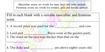 Explore the colorful world of genders with our Masculine and Feminine worksheet, designed to spark curiosity and promote learning in kids. This interactive download from our learning app offers an engaging way for children to understand the concept of masculine and feminine words. With delightful visuals and age-appropriate examples, kids will grasp the essence of language and its nuances. From animals to everyday objects, this worksheet encourages them to identify and differentiate between masculine and feminine terms. Empower your child’s linguistic journey and watch them develop a deeper appreciation for language diversity. Download now to embark on a captivating educational adventure!