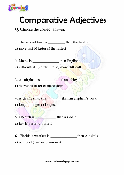 Komparative adjektiver kan være vanskelig grammatikk for 3. klassinger hvis de ikke øves og læres riktig. Derfor gir vi i læringsappene deg arbeidsark med komparative adjektiver for 3.-klassinger for å hjelpe dem med å erobre ferdighetene og metoden for å utføre komparative adjektiverspørsmål.
