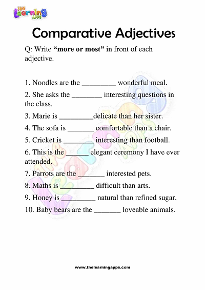 Komparative adjektiver kan være vanskelig grammatikk for 3. klassinger hvis de ikke øves og læres riktig. Derfor gir vi i læringsappene deg arbeidsark med komparative adjektiver for 3.-klassinger for å hjelpe dem med å erobre ferdighetene og metoden for å utføre komparative adjektiverspørsmål.