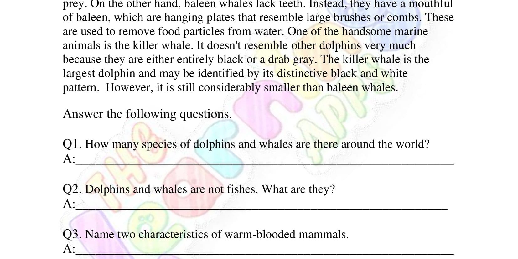 Non Fiction Reading Passages – Grade 3 – Dolphins and Whales View All Worksheets