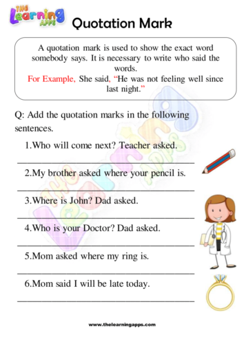 Introducing our engaging and interesting educational Quotation Marks Worksheet Set 03, designed to make learning punctuation fun for kids! This printable resource features a variety of exciting activities that help young learners build early foundation and grasp the concept of using quotation marks correctly. Through interactive exercises, kids will discover how to properly enclose direct speech or dialogue within quotation marks. With vibrant visuals and captivating exercises, this worksheet set encourages active participation and ensures a solid understanding of this essential punctuation skill. Download and print this worksheet set to provide your children with an enjoyable way to enhance their writing skills while mastering the art of using quotation marks accurately.