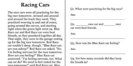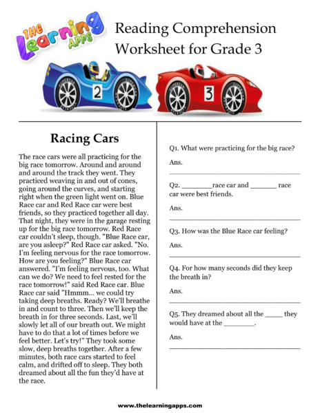 Download our free printable comprehension worksheets for grade 3. Racing Cars Comprehension Worksheet is one of the best way to engage your child in learning.